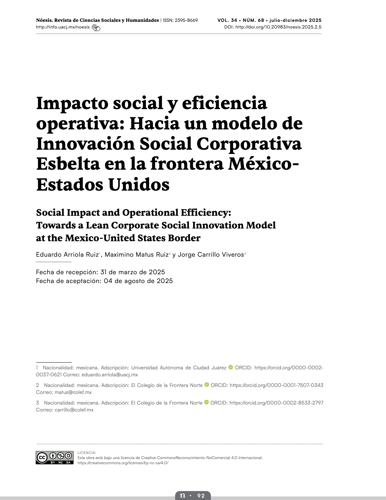 Fuente: Eduardo Arriola, Max Matus y Jorge Carrillo"Impacto social y eficiencia operativa: Hacia un modelo de Innovación Social Corporativa Esbelta en la frontera México-Estados Unidos" Noesis, volumen 34, núm. 68, julio-diciembre 2025 https://doi.org/10.20983/noesis.2025.2.5
